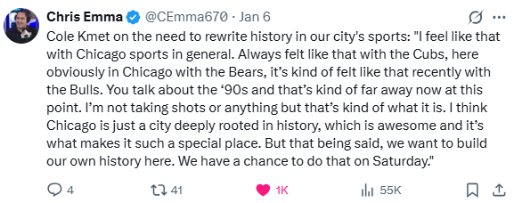 That’s how long we waited to see a Bears playoff win. Caleb Williams always talks about his desire to rewrite history in Chicago - to turn the franchise into a winner, to stay here for years next to Ben Johnson, and to compete for championships. On another Saturday night at Soldier Field, the Ice Man began his journey for history.