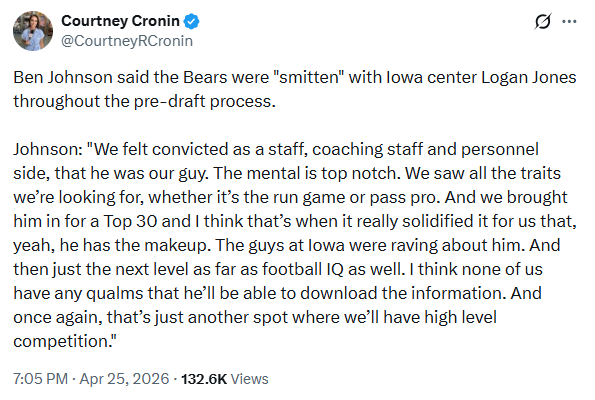 Everyone with the Bears fell in love with Jones during the pre-draft process and knew they had to find a way to get him. He has all of the traits you could want at center: intelligence, toughness, leadership, processing, and quickness.